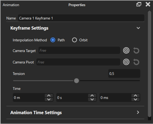 Keyframe-EinstellungenDiese Einstellungen werden einzeln für jeden Keyframe auf der Animationszeitleiste gespeichert. Dadurch können Sie für jeden Ihrer Keyframes unterschiedliche Einstellungen vornehmen. Interpolationsmethode Die Interpolationsmethode definiert das Verhalten Ihrer Kamera zwischen zwei verschiedenen Keyframes. Bei der Pfadmethode wird die Kamera in einer geraden Linie bewegt, während bei der Orbitmethode versucht wird, die Distanz zu Ihrem Ziel beizubehalten und so eine Umlaufbahn zu erstellen. Kameraziel Mit dem Kameraziel können Sie ein bestimmtes Objekt festlegen, das Ihre Kamera als Ziel behalten soll. Kamera Drehpunkt Mit dem Kamera-Drehpunkt können Sie ein bestimmtes Objekt festlegen, um das sich Ihre Kamera drehen soll. Spannung Dadurch können Sie die Schärfe des Pfades anpassen. Durch Erhöhen des Werts wird die Richtungsänderung an den Keyframes schärfer, während niedrigere Werte einen glatteren Pfad erzeugen. Zeit Mit der Zeiteinstellung können Sie die genaue Zeit Ihres Keyframes auf der Zeitleiste festlegen. |