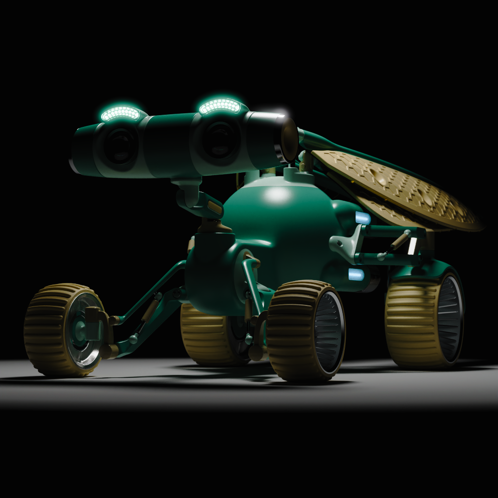 Positionieren des Highlight auf dem „Kopf“ des Roboters. (a) Positionieren des Lichts als Deckenlicht. (b) Positionieren eines weit entferntes Licht, um auf das Vorderrad des Roboters zu zielen. (c) Positionieren eines Randlichts hinter dem Roboter. (d)