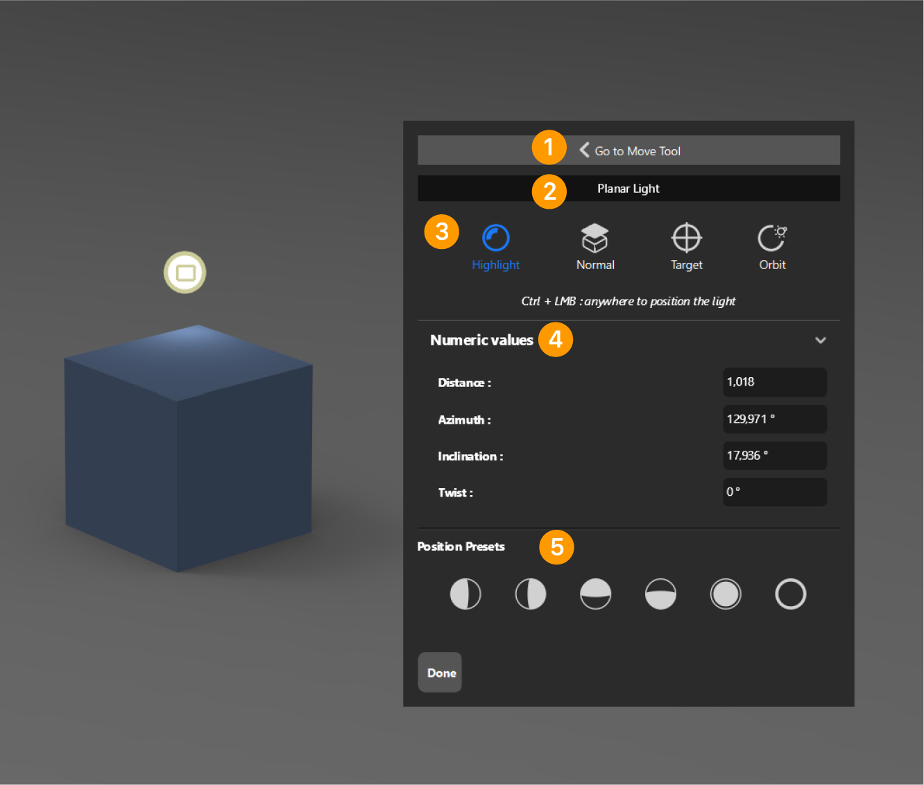 Wählen Sie eine der sechs Voreinstellungen aus, um Ihr Licht schnell um ein Modell herum relativ zu Ihrer aktiven Kamera zu positionieren.