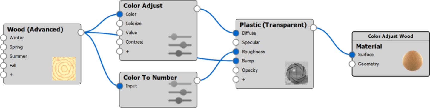 Die folgenden Beispiele zeigen wie Sie einen Farbanpassungs-Knoten verwenden können, um die Farbe der Holz-Textur einfach anzupassen.
