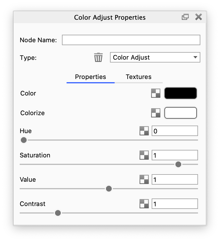 Färben Sie prozedurale Texturen ein oder passen Sie eine existierende Farbe durch Farbton, Sättigung, Wert und Kontrast. Sie können jedem der Parameter eine Textur zuweisen.