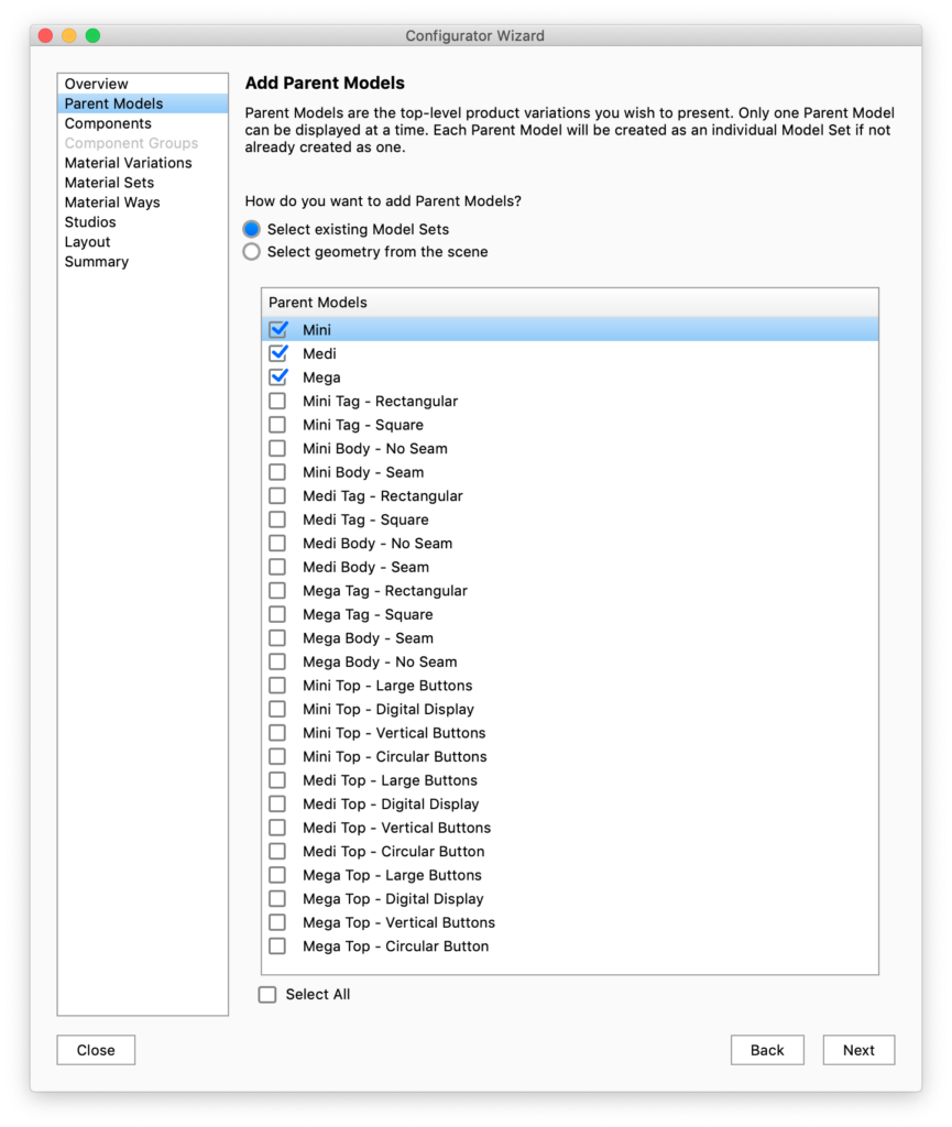 Wenn Sie nicht jedes Ihrer übergeordneten Modelle und Komponenten in separaten Modell-Sets haben, können Sie sie hier erstellen, indem Sie die Option Geometrie aus der Szene auswählen. Aktivieren Sie dazu das Kontrollkästchen neben dem Modell oder den Bauteilen, die Sie als übergeordnetes Modell definieren möchten, und klicken Sie über der Liste Übergeordnete Modelle auf die Schaltfläche Modell-Set hinzufügen. Dadurch wird automatisch ein Modell-Set im Projektfenster erstellt. Sobald ein oder mehrere übergeordnete Modelle im Konfigurator-Assistenten hinzugefügt wurden, können Sie sie in der Liste auswählen und auf die Schaltfläche Vorschau klicken, um sie in Echtzeit anzuzeigen und zu bestätigen.