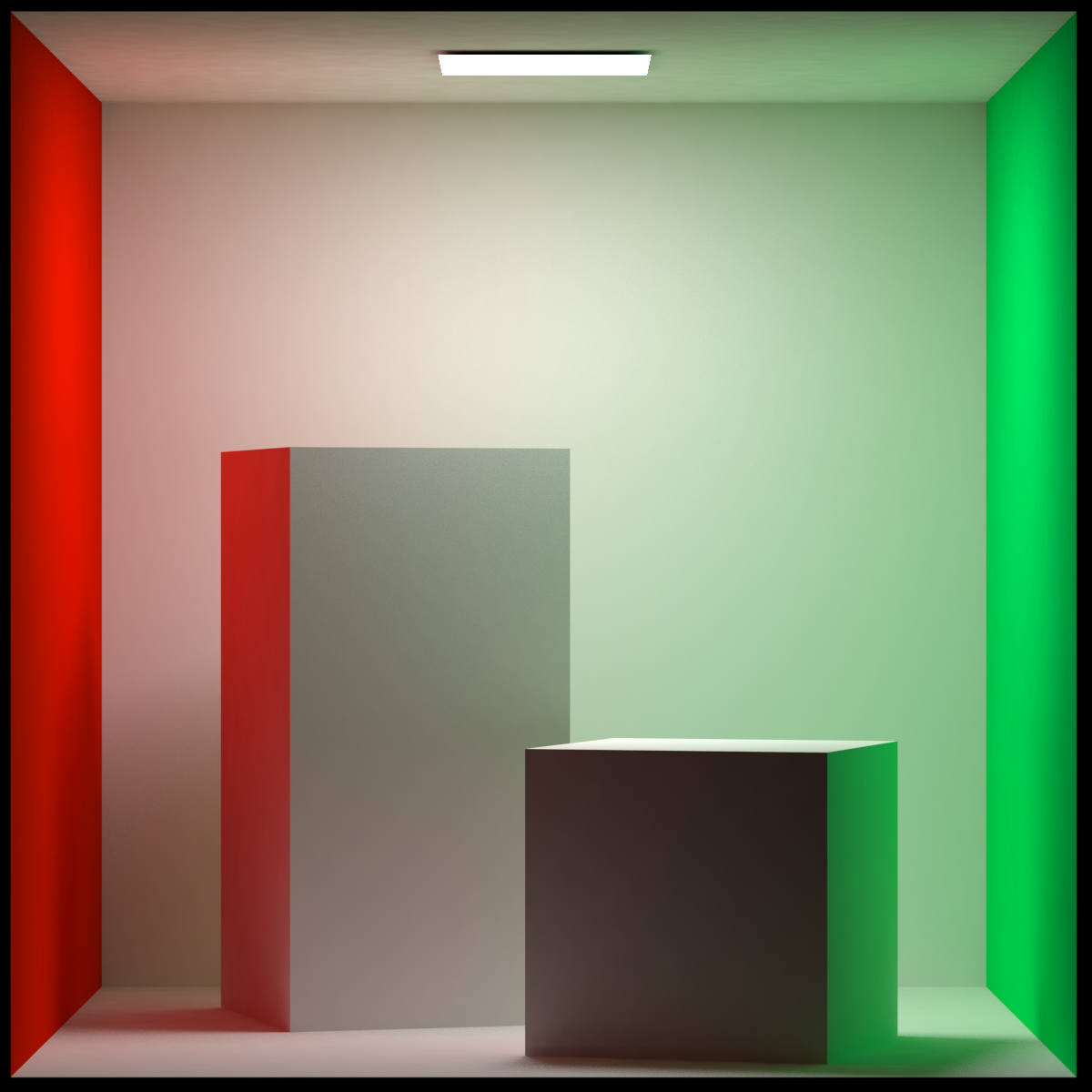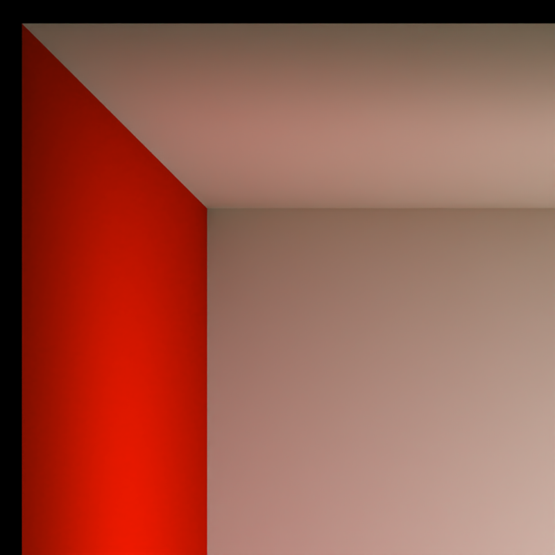 In der folgenden Szene, die von einem einzelnen Flächenlicht oben in der Box beleuchtet wird, wird die Oberfläche der Decke nur durch globale Beleuchtung beleuchtet. Licht von dem Flächenlicht wird diffus von der Geometrie in der Box reflektiert und an die Decke zurückgeworfen.