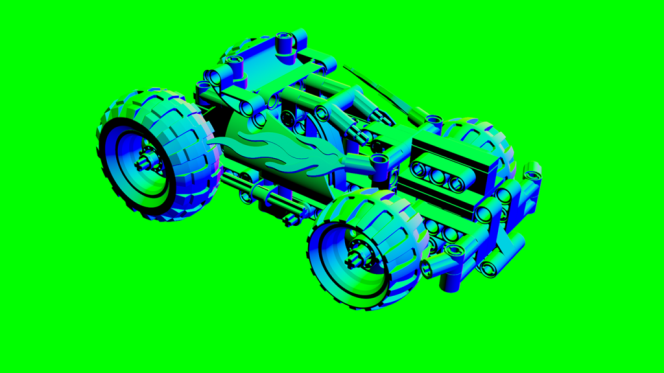 Der Normal-Durchgang erstellt ein Bild, in dem jedes Pixel die Ausrichtung der Geometrie unter Verwendung der Oberflächennormalen in der Szene darstellt. Standardmäßig werden die Normalen in den Weltkoordinaten (relativ zur Szene) generiert. Wenn der Normal-Pass aktiviert ist, haben Sie die Möglichkeit, “Kameraraum-Normalen” zu aktivieren, auf die über das Icon Ein Normal-Pass kann hilfreich sein, um die Beleuchtung im nach hinein zu bearbeiten , ohne die Szene neu rendern zu müssen. |