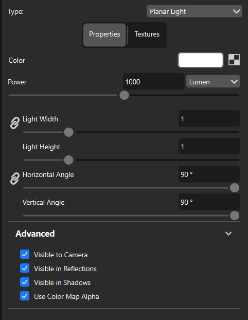 Ähnlich wie ein Flächenlicht ist das Planarlicht ein Materialtyp, der für diffuse Beleuchtung sorgt. Es funktioniert ähnlich wie ein Flutlicht, bietet Ihnen jedoch durch seine Spreizwinkel zusätzliche Flexibilität.