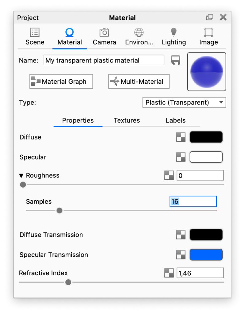 Materialien: Clear Shiny Plastic Grey und Clear Shiny Plastic Blue aus der Material-Bibliothek. |