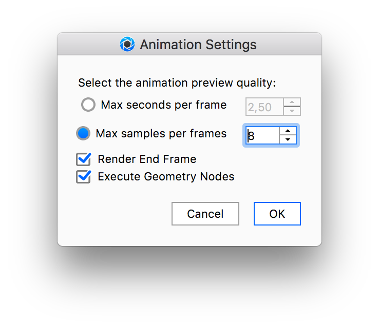 Click the settings icon to open the settings panel where you can select from Max seconds per frame to limit the render time of the preview, or choose Max samples per frames to limit the quality of the preview. You can also choose to in-/exclude the last frame and if Geometry nodes should be executed for the animation – see the Geometry Node Types page for more info. -