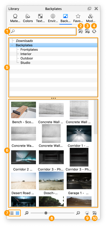Thumbnails of backplates within the selected folder. - List/Thumbnail Toggle