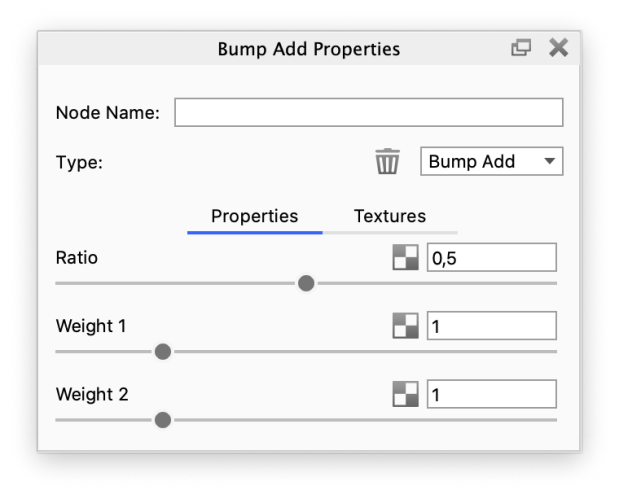 The Ratio and Weights control the contribution of the two input bump maps to the final bump result. Ratio: The Ratio parameter allows to balance the contribution of both input bump maps with a single slider. The default value of 0.5 defines that both bump maps contribute equally to the final bump result. With a value of 0 only Bump 1 affects the material, whereas with a value of 1 only Bump 2 is visible. Weight: The two Weight parameters work like a multiplier for each of the two bump texture’s Bump Height. The default values of 1 keeps the bump height as defined on the texture. When the Weight for a bump input is 0, the effect of that bump is nullified. Values higher than 1 amplify the bump effect in the final result. |