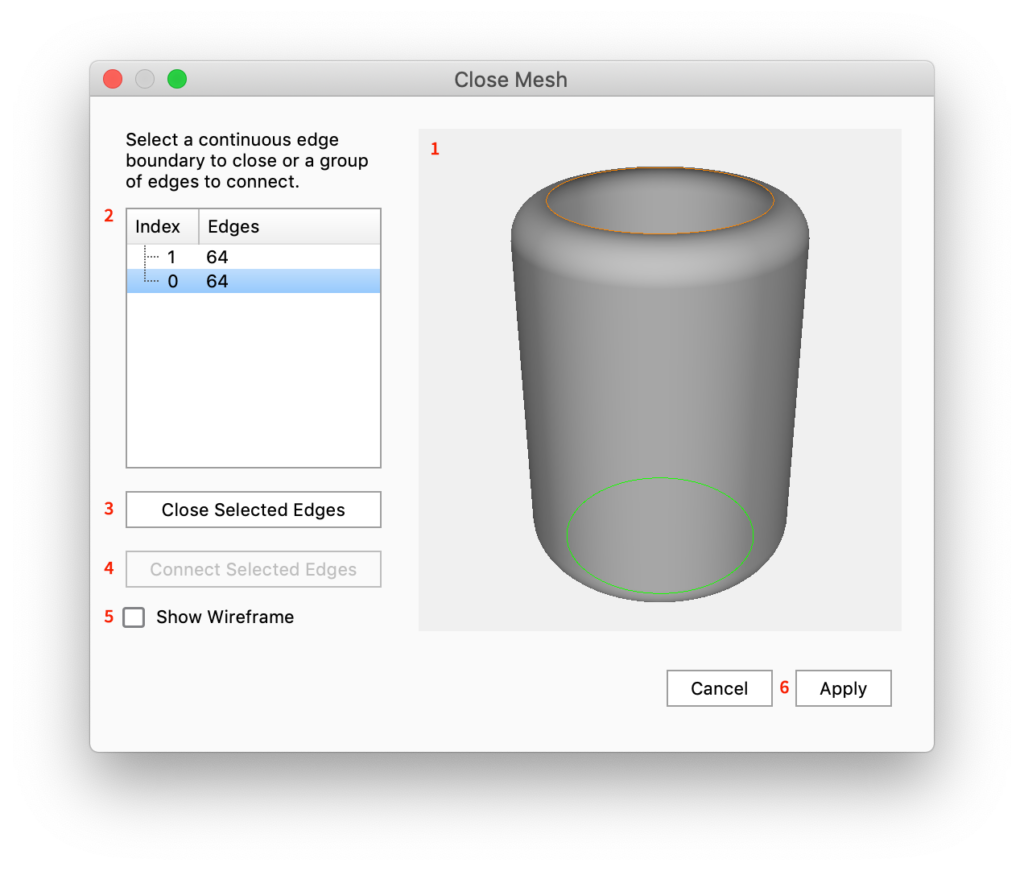 - The Close Mesh tool will list the open edges of the part you selected. In the preview any open edges will be displayed with a green line.