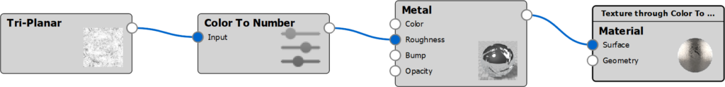 The Color To Number node converts color values to number values. This is usually done implicitly such that black is zero and white is 1, however there are times where you need more control. This is quite useful, for example, with roughness maps where you can use Color To Number to easily map a gray scale image to go from e.g. 0.05 to 0.10 – this would be hard to do otherwise.