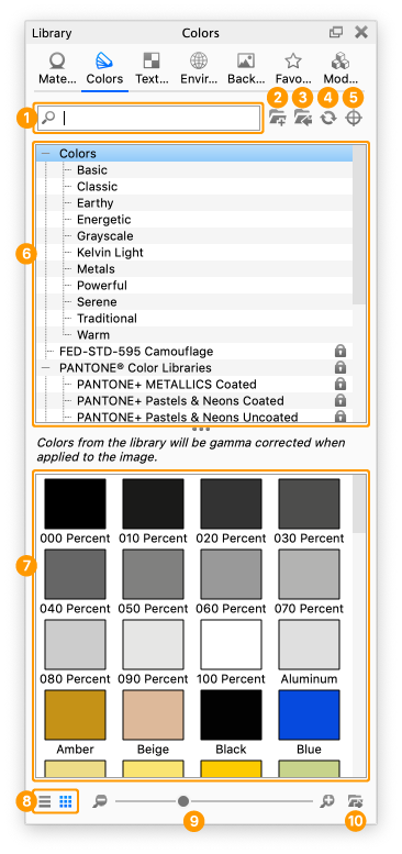Displays color swatches within the selected folder. - List/Thumbnail Toggle
