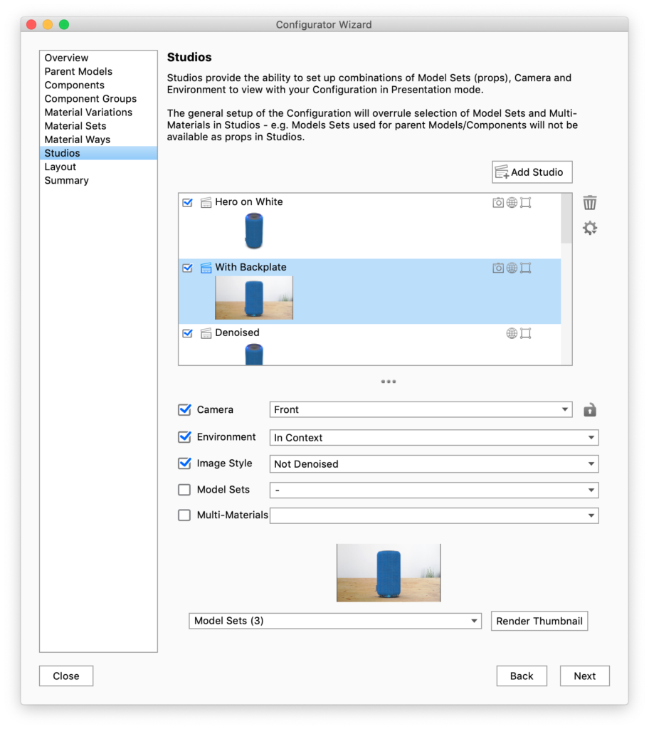 The Configurator Wizard enables you to set up a string of model and material choices for your product. Furthermore you can select a number of studios on which your model can be viewed.