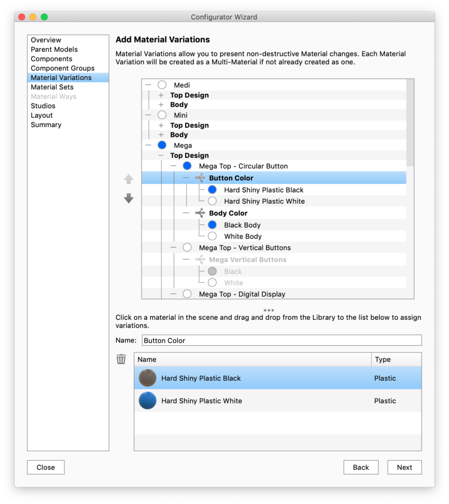 The first step of the Configurator Wizard is to select what you want to present – Model Variations, Material Variations, or both.
