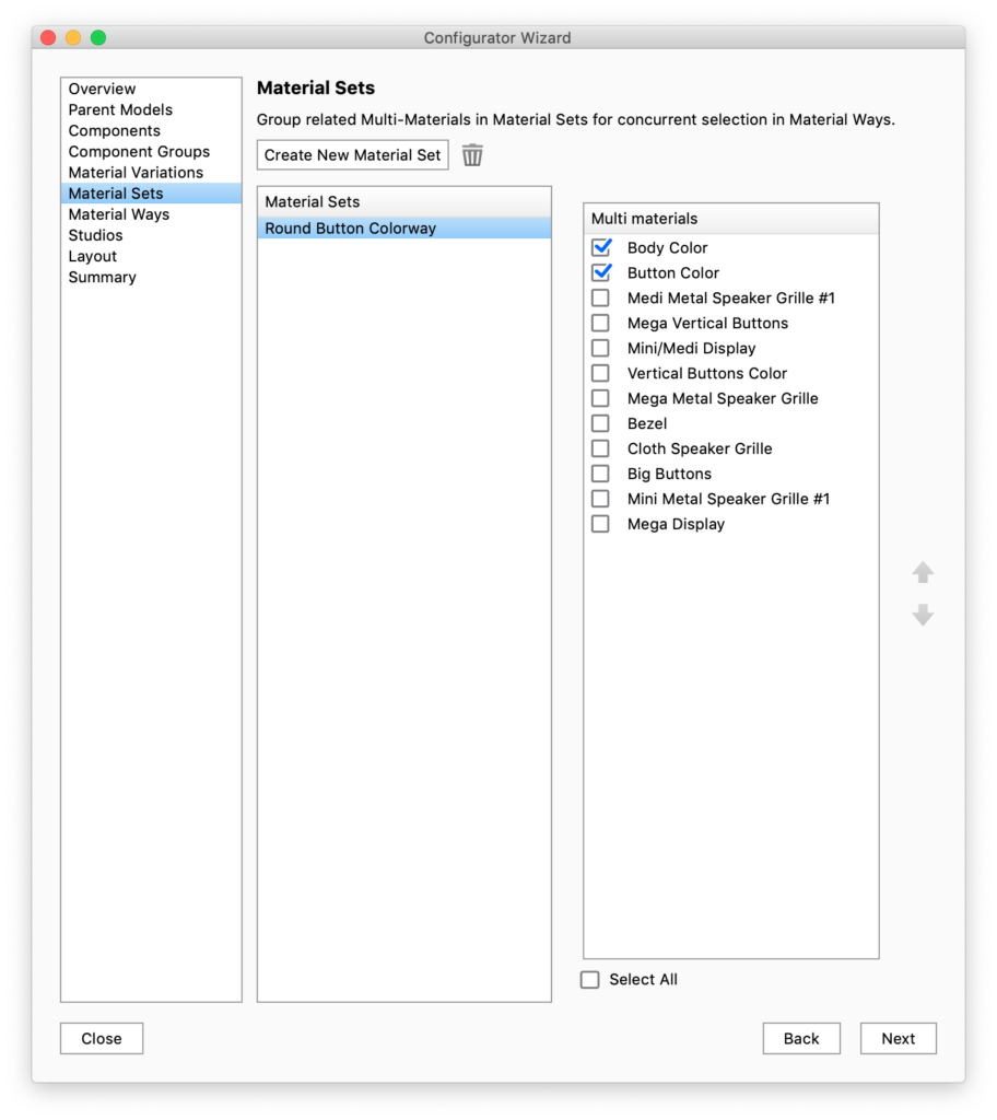 Use to set up a Configurator to display different materials for a single model.