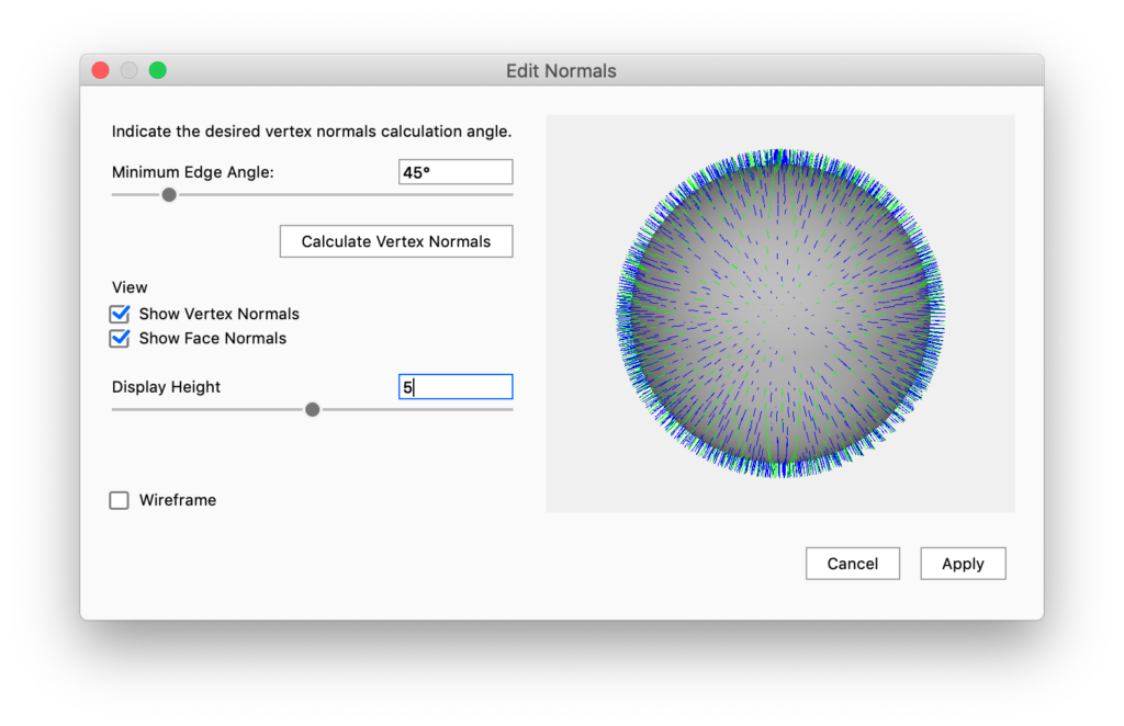 - Show Vertex Normals: toggle visibility of the (green) vertex normal indicators.