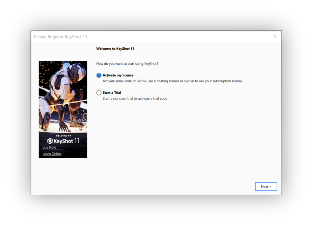First time you launch KeyShot Studio on a new machine, you will be asked if you have a license or if you want to try KeyShot Studio. If you already have a bought KeyShot Studio or have access to a Floating license, select Activate License, otherwise you can select Get a Trial and get a free Trial.