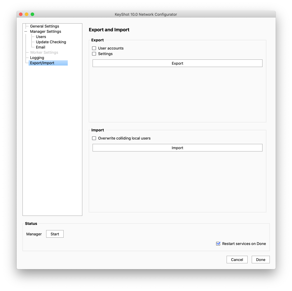 If you need to move your Network Rendering installation or simply want to reuse your current settings when upgrading, you can export User Accounts and/or Settings and import them on the new computer.