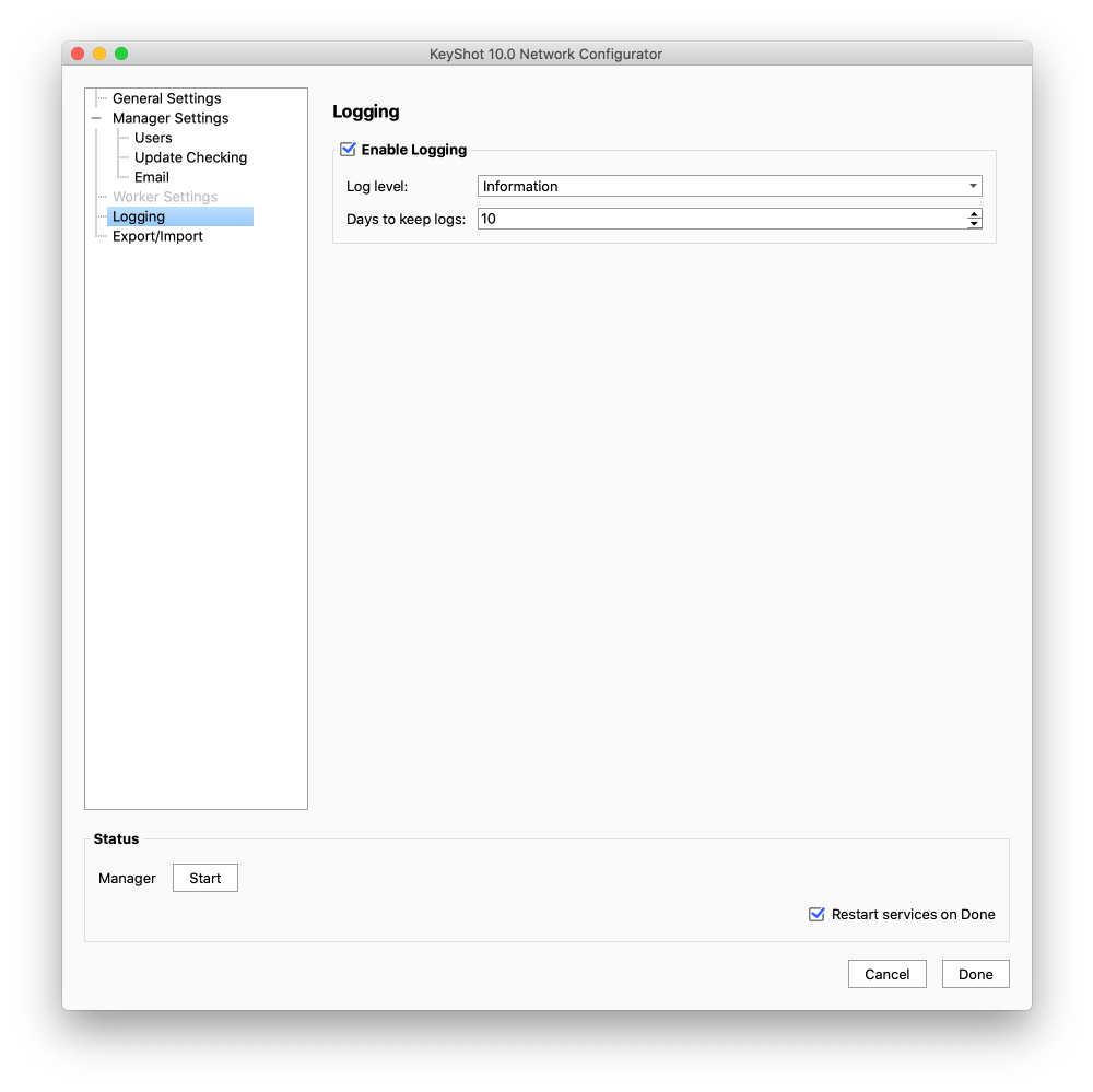The log files keep track of Network Rendering state, information, and potential errors. If you enable logging on your manager you can select which incidents you want logged and how long to keep the logs. The Logs will be stored in the Resources folder (as set in the general settings). And they can be viewed in the Monitor. To enable logging, click on “logging” in the KeyShot Network Configurator and check the “Enable logging” option.