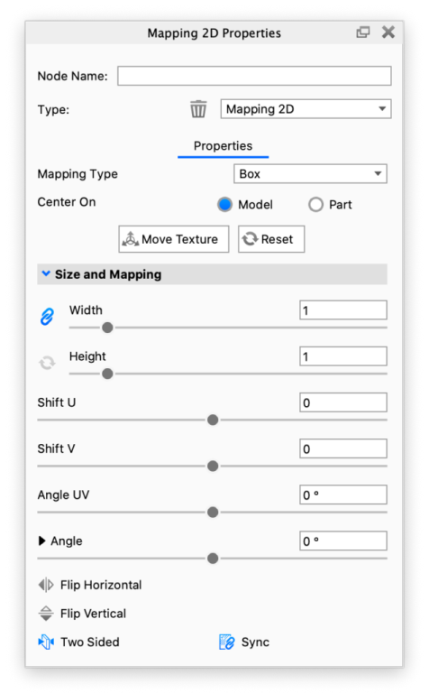 The texture Size and Mapping that is set in the Mapping 2D node is propagated to all textures it is connected to, thus aligning them. When the Mapping Type for the connected textures is set to Node, the Size and Mapping properties of the texture nodes function as offsets from the Mapping 2D properties. For example, Width and Height become scalar (unitless) and are effectively multipliers of the Width and Height set in the Mapping 2D node.