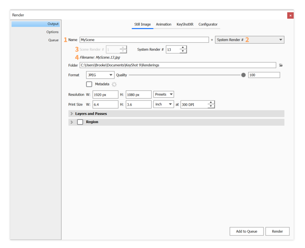 - Scene Render #: Adds a number that is incremented each time you render the current scene. This number is saved with the scene, so you can continue the sequence where you left off, no matter what KeyShot 9.1+ computer you use – Just make sure to save the scene if you want to continue the sequence. The number can be reset via the Scene Render number spinbox below the Prefix in the output tab.
