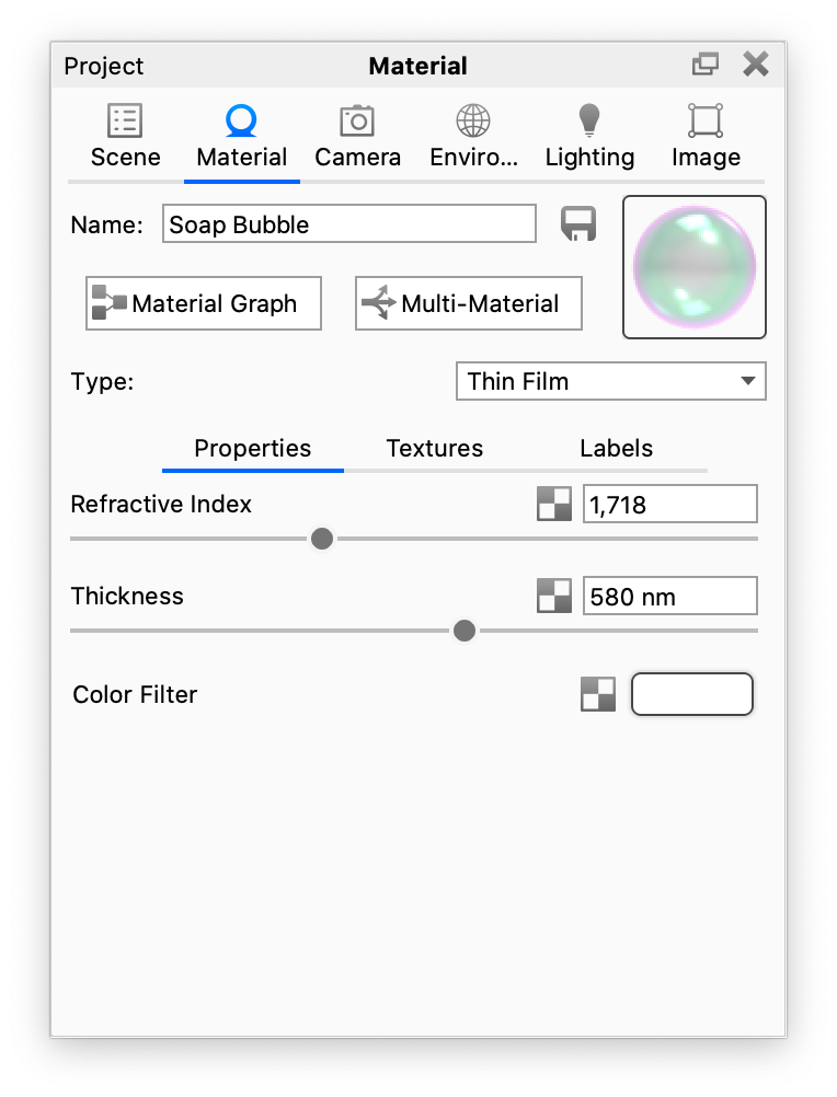 The Thin Film material type produces an iridescent effect similar to a soap bubble.
