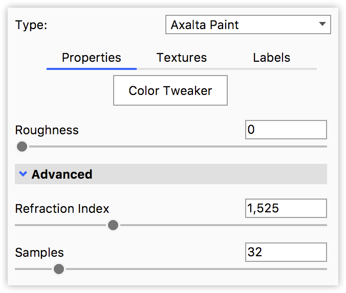 FarboptimierungErweiterte Option zur Feineinstellung der Farb-Eigenschaften bei Betrachtung aus bestimmten Winkeln. RauheitBei höheren Werten werden der Materialoberfläche mikroskopisch kleine Unregelmäßigkeiten hinzugefügt. Bei 0 erscheint das Material vollkommen glatt und poliert. Wird der Wert erhöht, wirkt das Material rauer, da das Licht über die Oberfläche gestreut wird. |