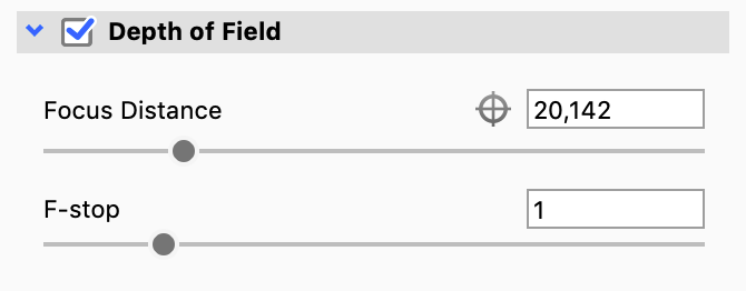 Um die Schärfentiefe zu aktivieren, gehen Sie zu Projekt > Kamera und klicken Sie auf das Kontrollkästchen Schärfentiefe oder drücken Sie die D-Taste. Wenn diese Option aktiviert ist, können Sie entweder die Schaltfläche Fokuspunkt auswählen oder die manuellen Werte verwenden.