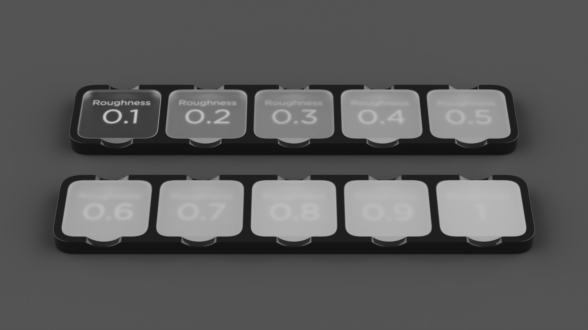 Regelt die Rauheit der Lichtbrechung. Der Hauptunterschied zwischen diesem Parameter und Rauheit besteht darin, dass Rauheit auf den Bereich innerhalb des Materials wirkt. Dies kann dazu benutzt werden, eine mattierte Optik zu erzeugen und gleichzeitig eine glänzende Oberfläche zu erhalten. Das Material benötigt dann noch etwas Transparenz über die Gerichtete Transmission, damit der Effekt erkennbar wird.