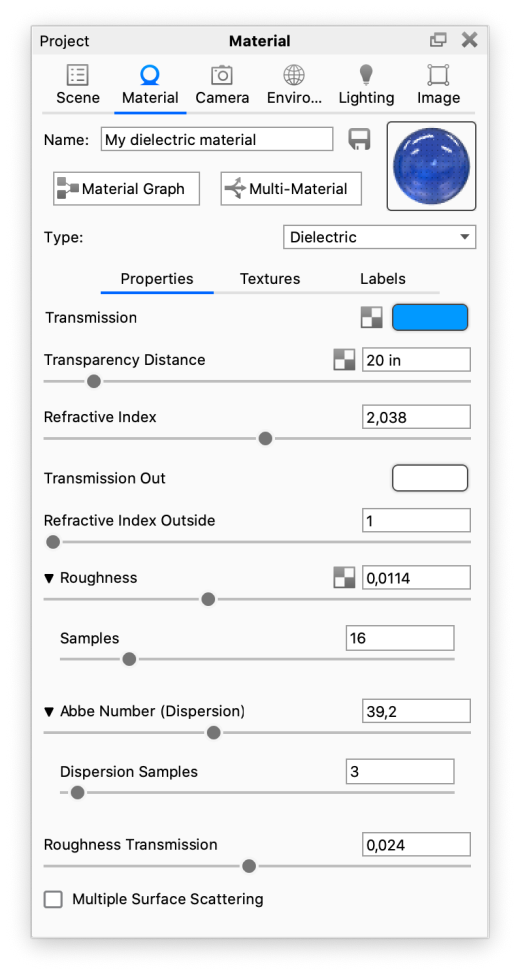 Der Materialtyp Dielektrikum bietet erweiterte Möglichkeiten zum Erzeugen von Glasmaterialien. Im Vergleich zum Materialtyp Vollglas sind hier zusätzliche Einstellungen für die Streuung (AbbeZahl) zu finden und der Materialtyp kann auch dazu verwendet werden, eine naturgetreue Grenzfläche zwischen Glas und Flüssigkeiten zu erzeugen. |