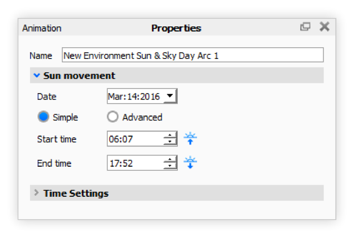 Mit der Sonne & Himmel Tagesverlauf Animation können Sie Animationen erstellen, die die Rotation der Sonne während des Tages simulieren.