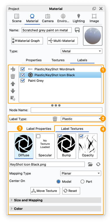 Etiketten dienen zum einfachen Platzieren von Logos, Aufklebern oder Videos, die frei auf einem 3D-Modell platziert werden können. Sie können Etiketten auch verwenden, um ein überlagertes Erscheinungsbild mit einem anderen Material über dem Hauptmaterial zu erstellen.
