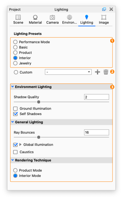 1. BeleuchtungsvoreinstellungenKeyShot hat 5 Beleuchtungsvoreinstellungen welche die Anwendung globaler Lichteinstellungen vereinfachen. Sie finden eine Beschreibung jeder Voreinstellung im Beleuchtungsabschnitt. 2. BenutzerdefiniertHaben Sie ein Beleuchtungs-Setup erstellt, können Sie dieses als benutzerdefinierte Voreinstellung speichern, um Sie in anderen Szenen wiederzuverwenden. Klicken Sie einfach auf das 3. Environmental LightingDies erlaubt Ihnen vollständige Kontrolle über die Beleuchtungsoptionen. Für eine genau Erklärung der einzelnen Einstellungen gehen Sie zu Benutzerdefinierte Beleuchtungsvoreinstellungen. |