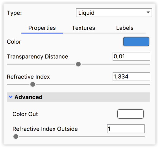 Der Materialtyp Flüssigkeit ist eine Variante des Materials Vollglas mit der zusätzlichen Möglichkeit, den äußeren Brechungsindex einzustellen. Damit können Sie naturgetreu Flächen erzeugen, welche die Grenzfläche etwa zwischen einem Glasgefäß und Wasser repräsentieren. Mehr Infos zu diesem Thema, finden Sie in diesem Blogeintrag. |