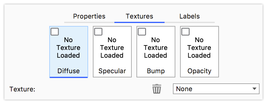 in den Materialeigenschaften finden, können Sie in den Eigenschaft eine Textur hinzufügen. Wenden Sie eine Textur per Ziehen & Ablegen aus der Bibliothek an, klicken Sie mit der rechten Maustaste, um einen Typ auszuwählen, oder klicken Sie, um eine Textur aus einer Datei zu laden. Wenn auf den Eigenschaften eine Textur angewendet wurde, können Sie darauf klicken, um sie anzupassen.