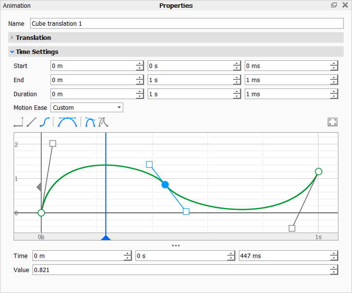 Kurven-Keyframes verfügen über Tangentengriffe, die manipuliert werden können, um den Übergang zu vereinfachen.