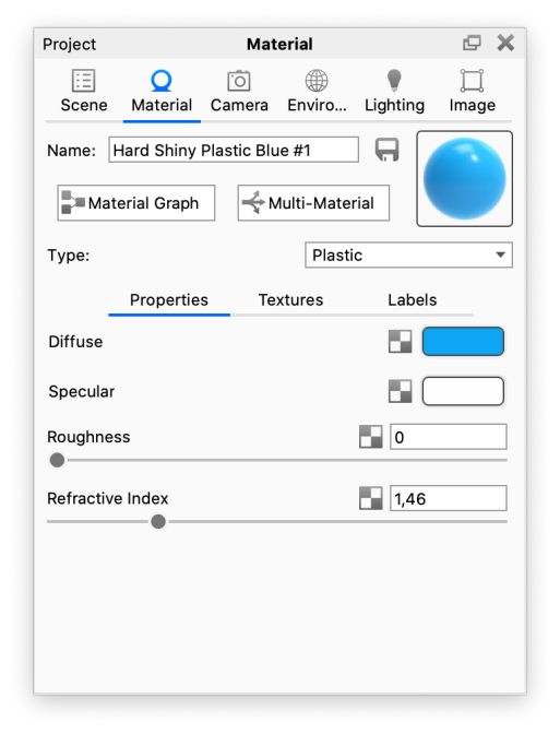 DiffusDies können Sie sich als die Grundfarbe des Materials vorstellen. Klicken Sie auf das Farbfeld, um die Farbauswahl zu öffnen und wählen Sie die gewünschte Farbe aus. SpiegelndRegelt die Farbe und Intensität der Reflexionen von Lichtquellen innerhalb der Szene. Schwarz deaktiviert die Reflexionen vollständig, während Weiß eine sehr glänzende Kunststoff-Optik erzeugt. Realistischer Kunststoff hat keine Farbe in der Einstellung Spiegelnd, deshalb sollten Sie grundsätzlich einen Grauton oder Weiß verwenden. Das Hinzufügen einer Farbe kann dem Kunststoff-Material allerdings einen metallischen Effekt verleihen. RauheitBei höheren Werten werden der Materialoberfläche mikroskopisch kleine Unregelmäßigkeiten hinzugefügt. Bei einem Wert von 0 wirkt ein Material absolut glatt und poliert. Bei höheren Werten erscheint das Material rauer, da Licht über die Oberfläche gestreut wird. |