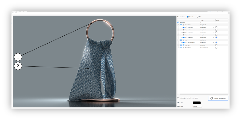 In the Scene Tree to the right you can choose if you want to base your callouts on materials or on parts, and on which materials/parts you want to have callouts on.