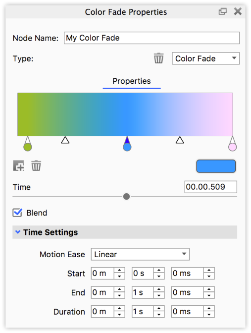 Time Blend Time SettingsUse these settings to control the timing and duration of the animation – see the Motion Ease types here. |