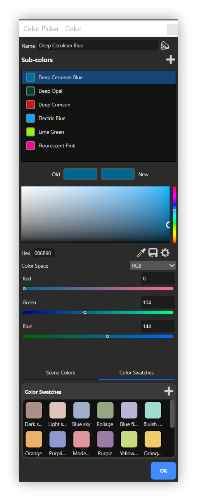 The Color Swatches at the bottom of the Color Picker provides quick access to colors you regularly use across scenes. Here, you can quickly add color swatches, refine them and, if desired, save the individual colors to a color folder later. The Color Swatches are loaded with preset colors.