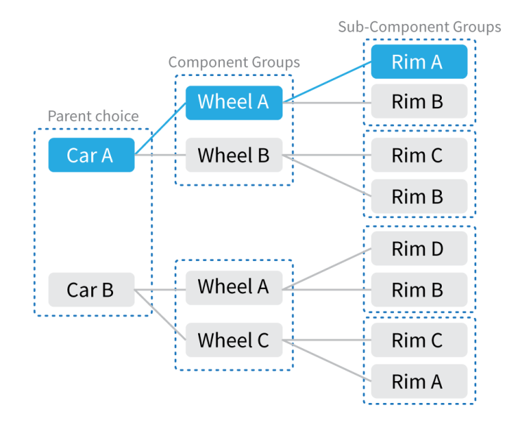 After selecting which Model Sets are going to be components in your Configurator, you need to set up the relationships between Parents and components in Component Groups and Sub-component Groups. A Component Group or Sub Component group is a group of components that the user can choose between. Component groups are tied to the choice of a specific Parent and Sub Component Groups are tied to the choice of a specific Component
