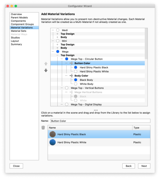 To add to an existing Multi-Material simply click the material in the list and drag new materials from the Library and drop them into the lower list. Add New Multi-Materials Once materials are in the list you can give the Material Variation a name i.e. Wheel Accent. This material will become a Multi-Material in your scene that can also be accessed and further edited from the Material tab. Remove Material Variations |