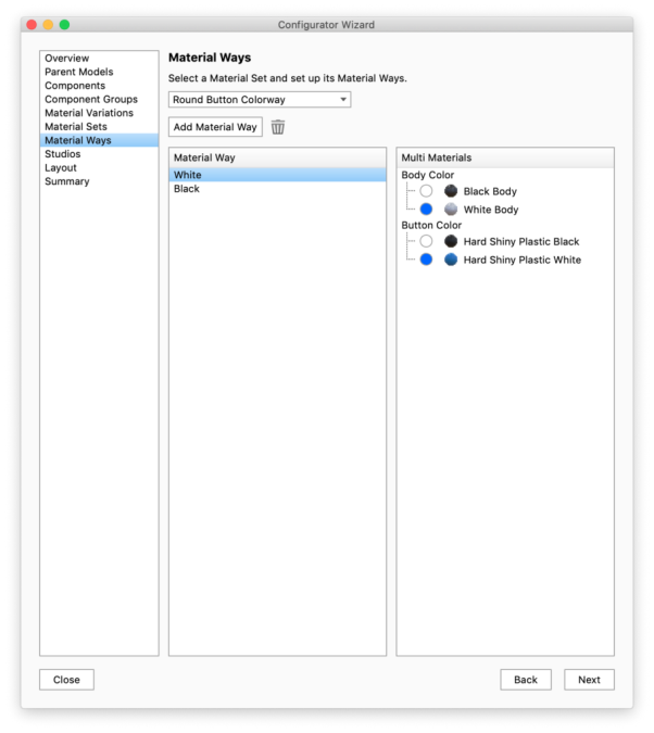 Select a Material Set in the drop-down and click Add Material Way. Then select the material combination you want in the current Material Way, by marking them with the blue bullet. Make sure to give each Material Way a useful name, as they will be used in presentation mode/KeyShot Viewer. |