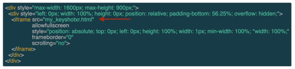 <div style="max-width: 1000px; max-height: 1000px"> <div style="left: 0px; width: 100%; height: 0px; position: relative; padding-bottom: 100%; overflow: hidden;"> <iframe style="position: absolute; top: 0px; left: 0px; height: 100%; width: 1px; min-width: 100%;" src="https://mywebserver.com/my_keyshotxr.html" frameborder="0" scrolling="no" allowfullscreen="allowfullscreen"></iframe> </div></div>