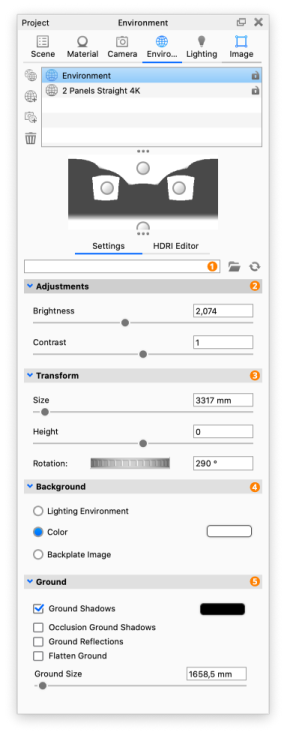 KeyShot Studio allows you to adjust your HDRI lighting through a set of easily adjustable Settings found in the Project window > Environment tab.