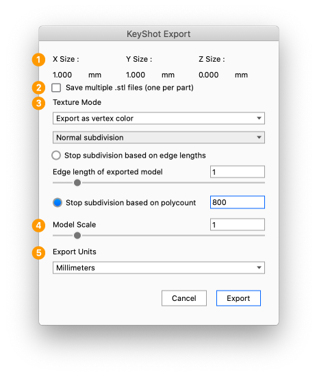 - Save multiple .stl files Enable this if you want KeyShot Studio to export each part to a separate STL file. A folder will be created for all the exported files.