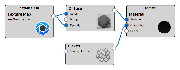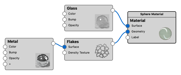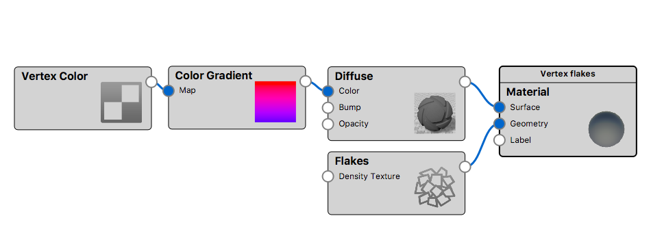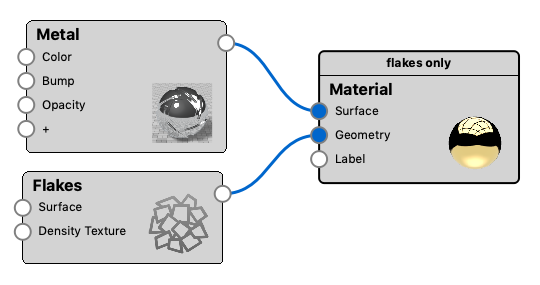 In this example the flakes are given a different material, than the base material, via the Surface slot on the Flake node.