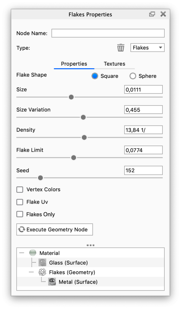 Gives you the option to add a surface to the flakes. If you choose to show the enclosing geometry, the flakes will by default share the base material with the original geometry.