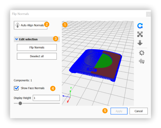 To finalize the flip normals, click Apply, to cancel the operation, click Cancel.
