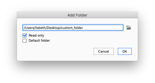 3. Browse to the folder you want to add and select if you want it to be the Read only or your Default folder. At least one default folder is required for each resource type.